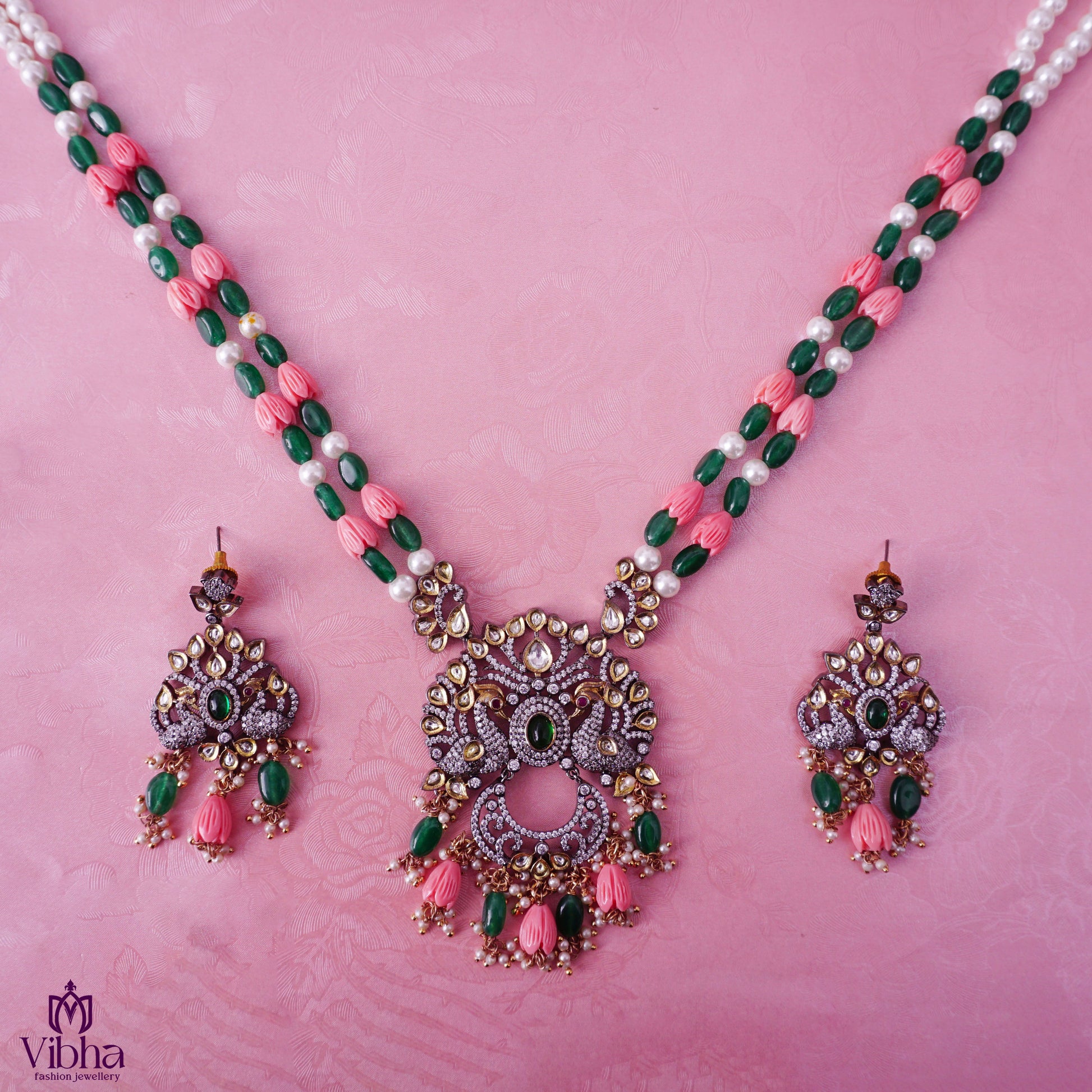 Enhance your traditional jewelry collection with this exquisite Beads Haram, featuring a chandbali-designed pendant adorned with intricate peacock motifs. This elegant piece is embedded with sparkling polki stones and American diamonds, radiating timeless grace. The haram is beautifully crafted with a mix of pearls, Monalisa beads, white pearls Gutta Pusalu, and tulip beads, adding richness and texture. Made from fine quality copper alloy and finished with a premium Victorian plating, this haram is perfect for party wear and festive attire.