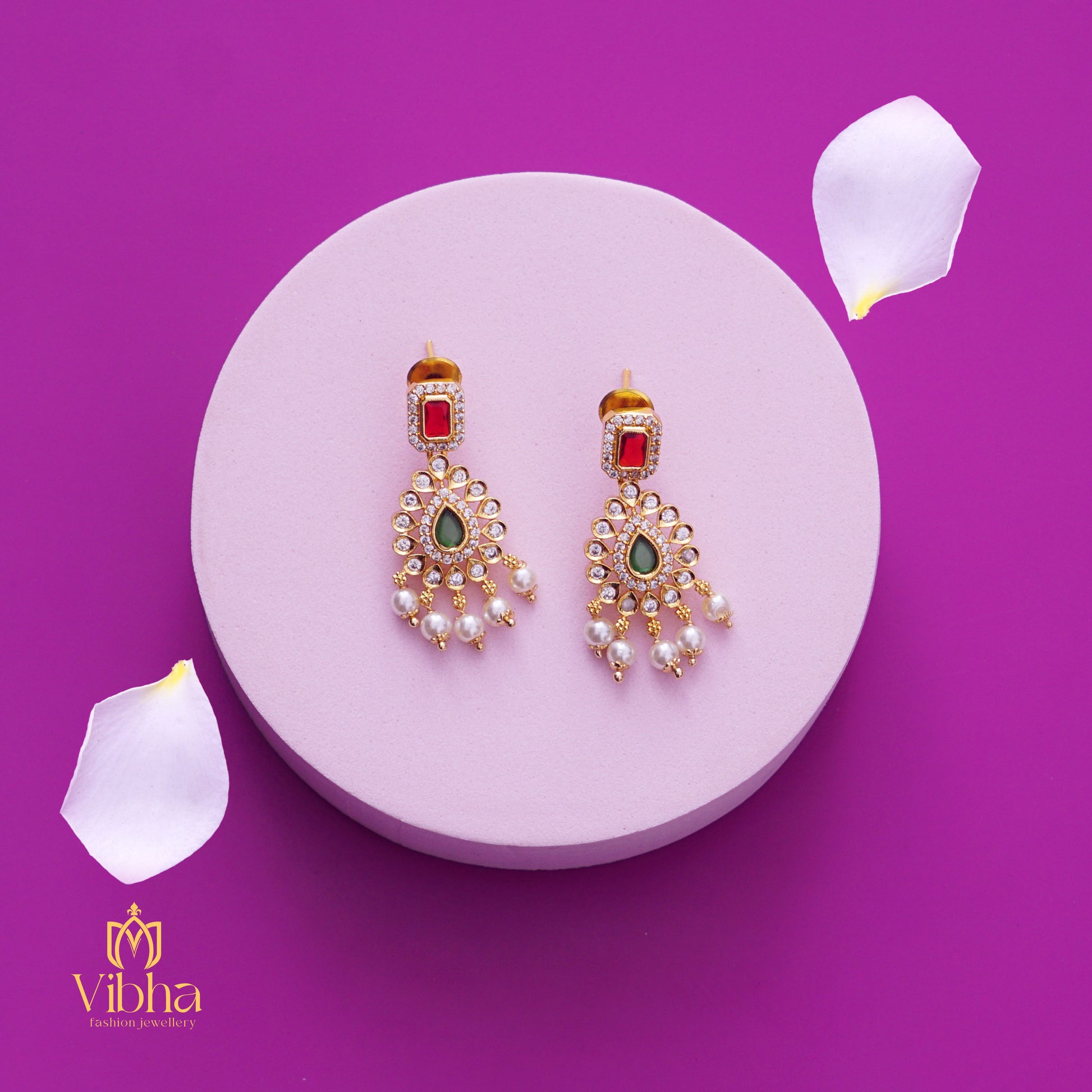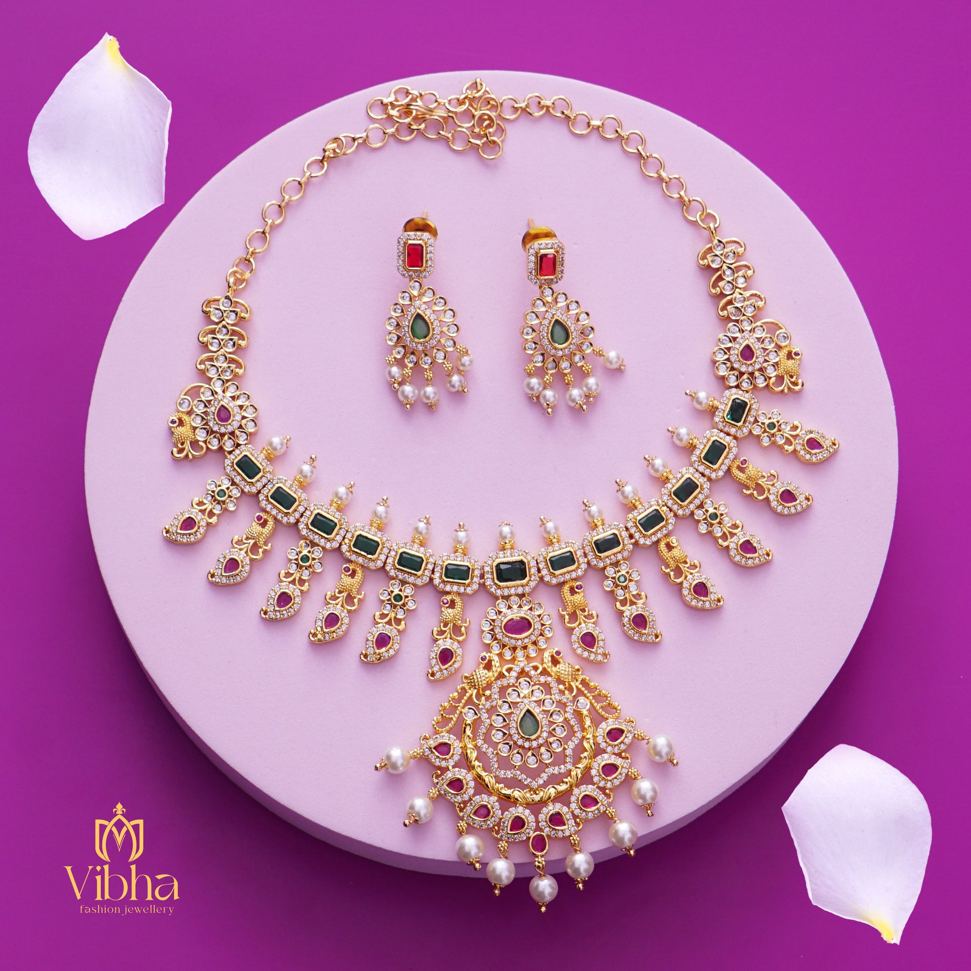 - Exquisite Craftsmanship: Intricate peacock design with floral motifs, adorned with artificial pearls and embedded with sparkling ruby, emeralds, American diamonds, and zircon stones.