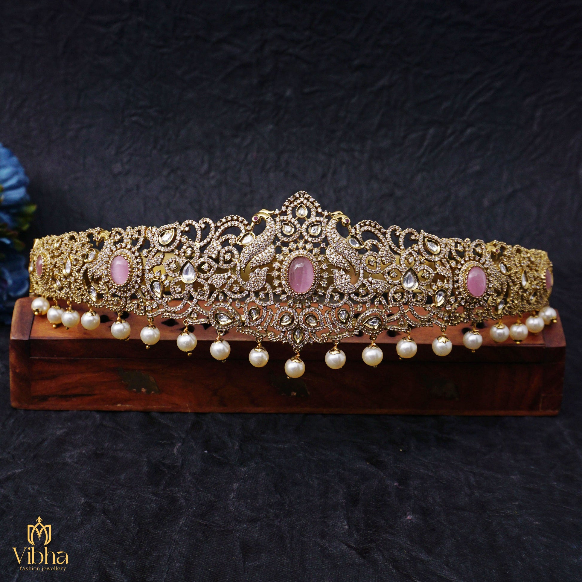 Accentuated with delicate white pearls and finished in a rich Mehandi Victorian plating, this Vaddanam reflects classic craftsmanship and opulent detail. Available in three charming variations – Mint Pink, Green, and Violet, it is a must-have statement piece for weddings, parties, and traditional celebrations.