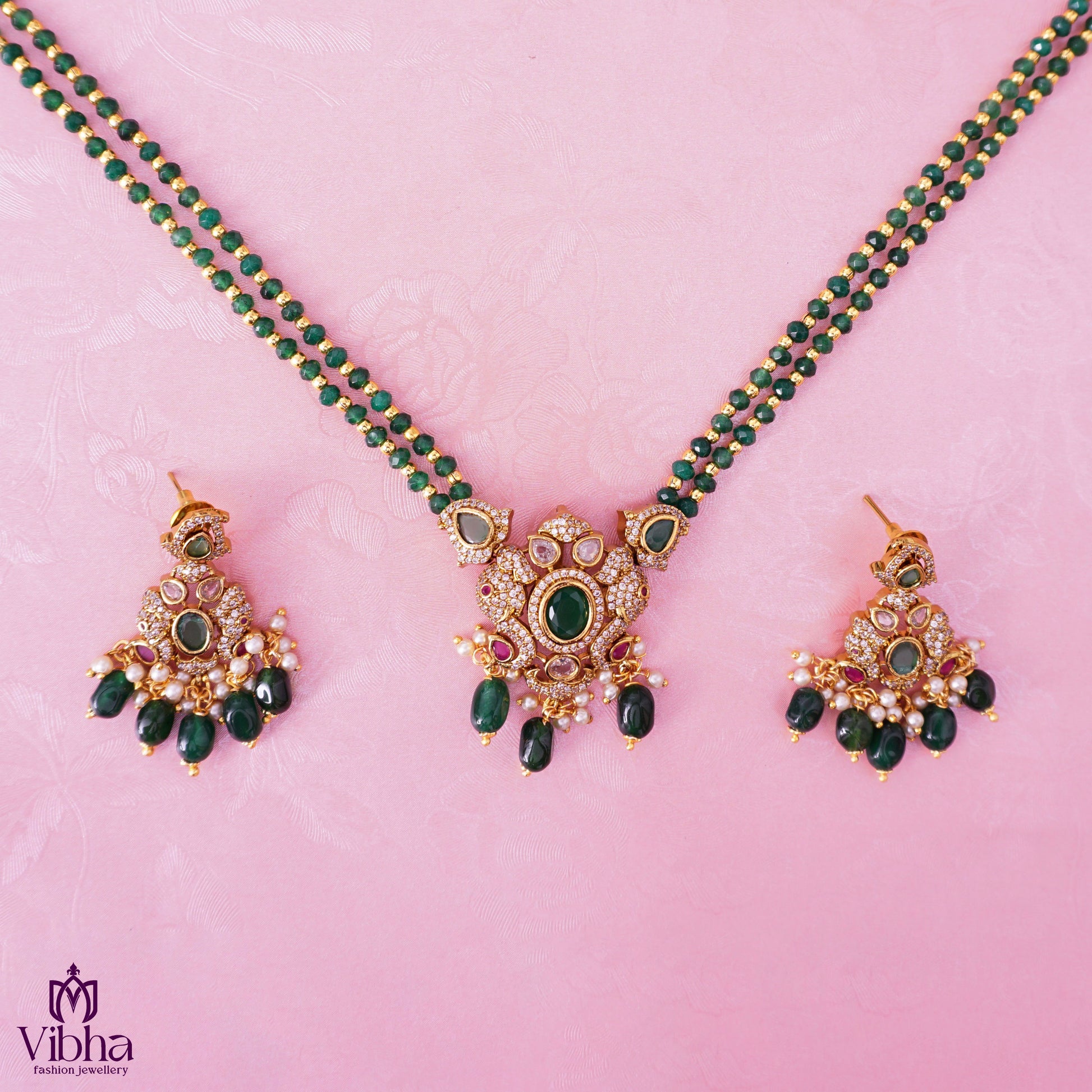 Double Lined Beads Haram with Elephant Pendant – Polki, Ruby, Emerald & Zircon Stones | Mehandi Victorian Finish