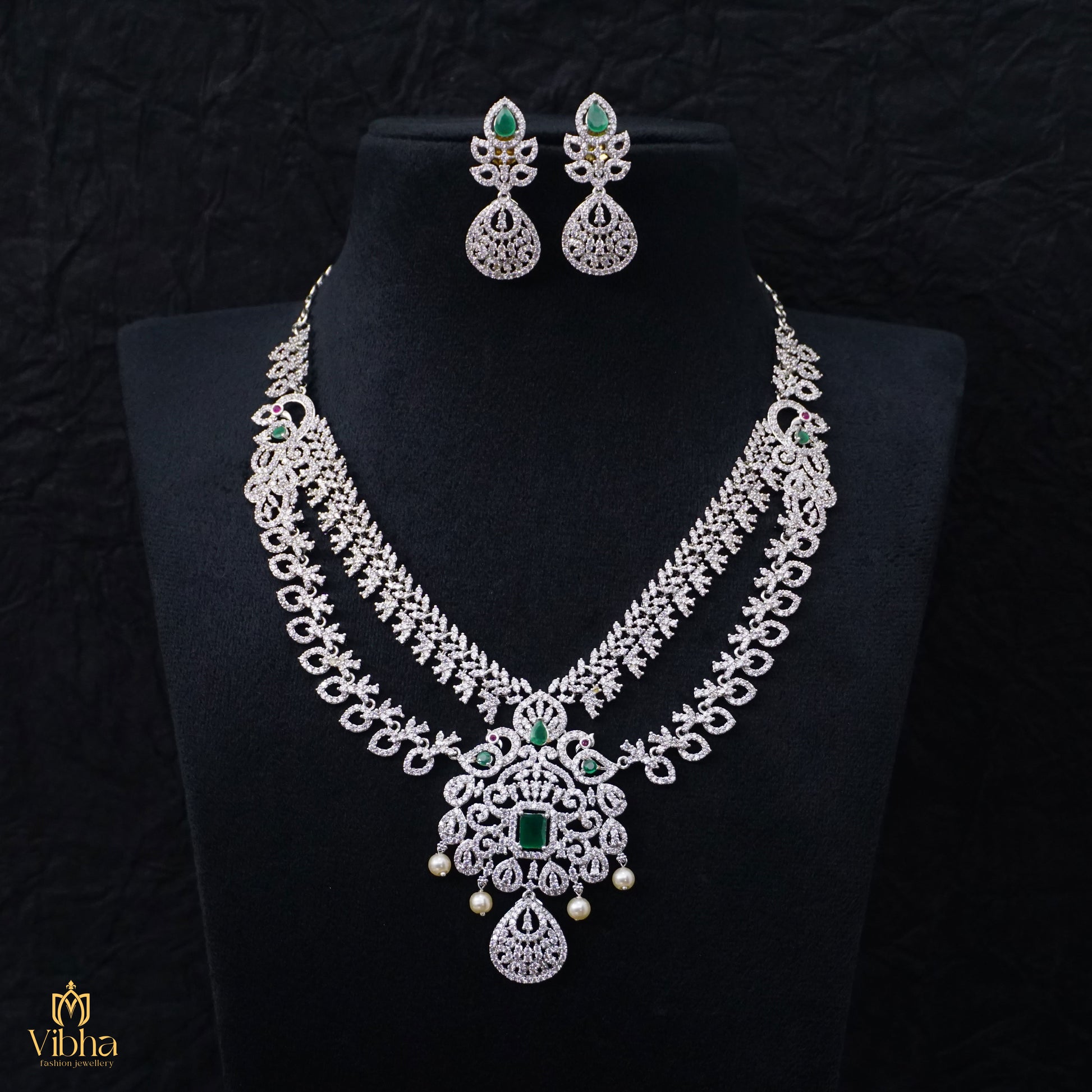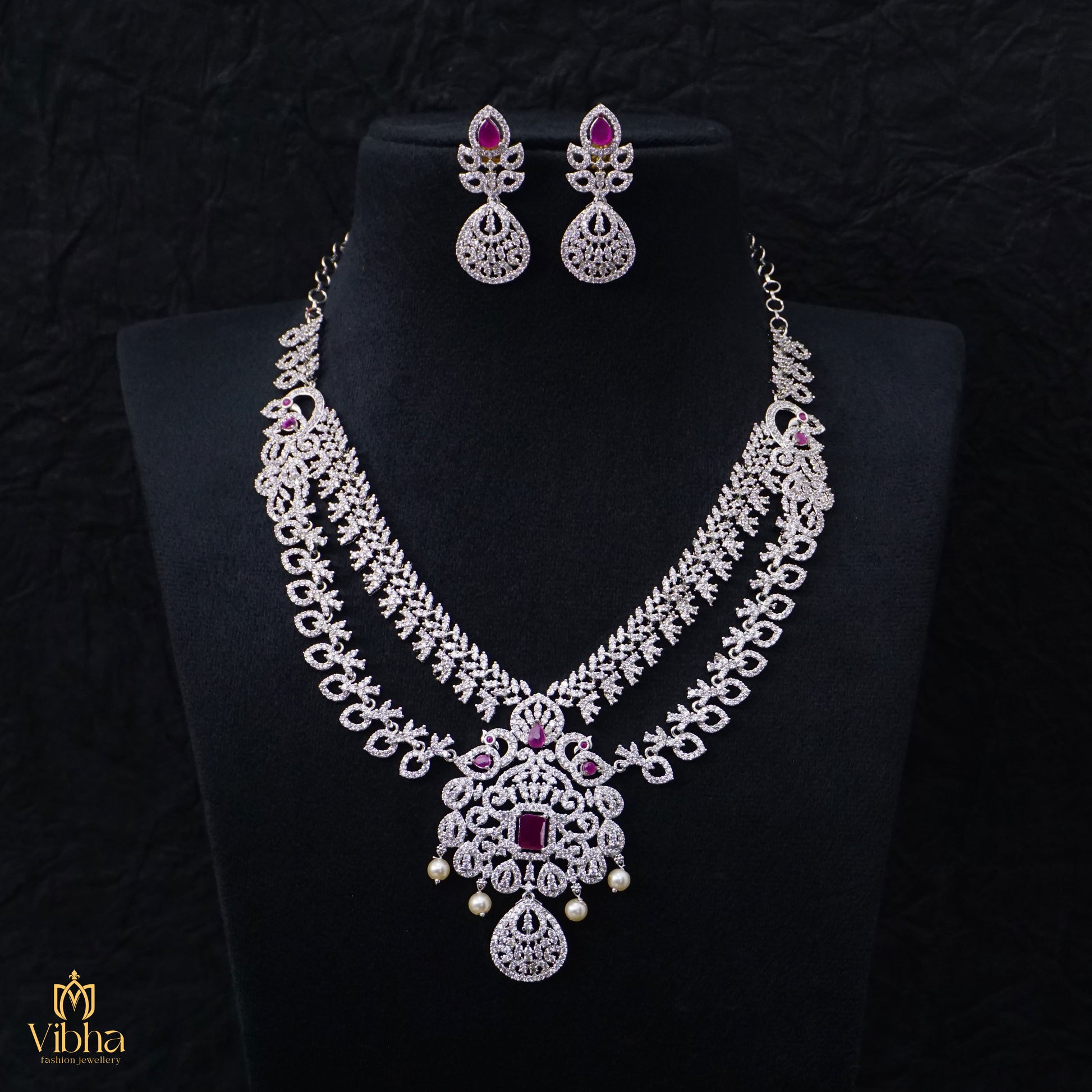 Double Step Non-Deity Bridal Necklace Set with Drop Motifs – American Diamonds & Zircon – Silver Finish – White Pearls – Festive & Party Wear