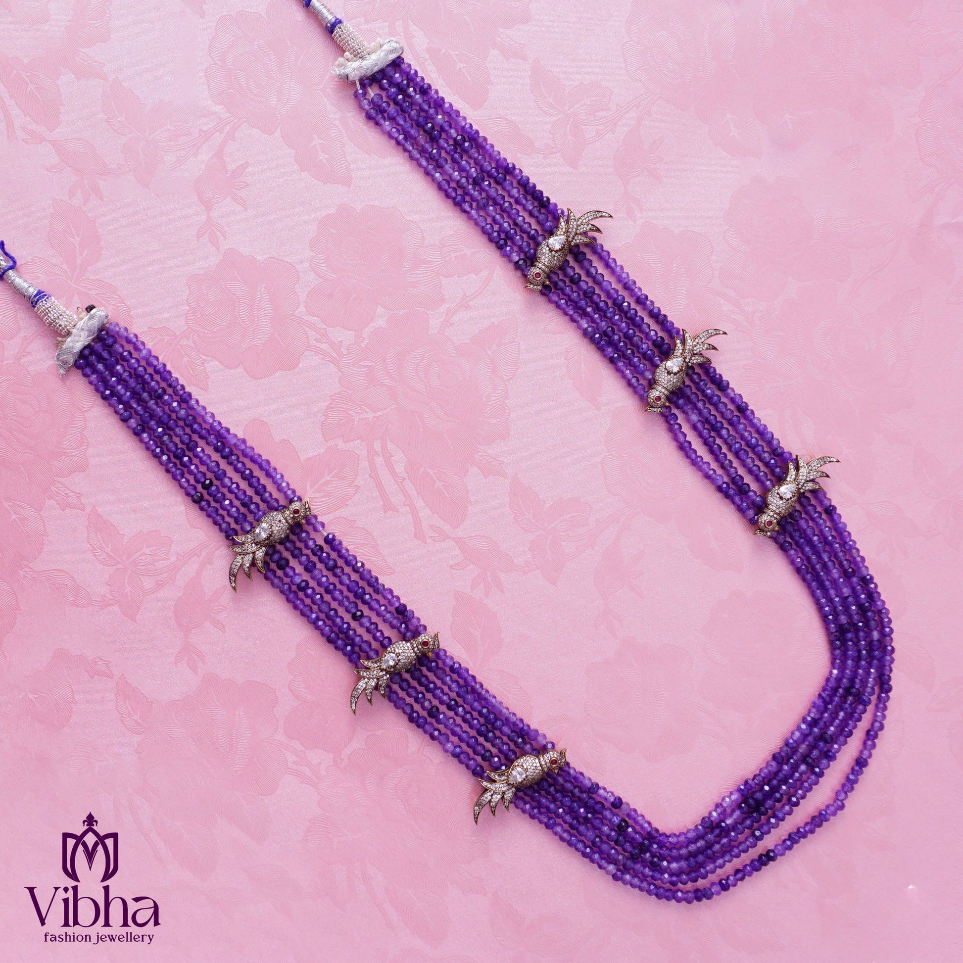 Enhance your bridal, festive, or party wear ensembles with this exquisite beads haram. Featuring an intricate peacock design complemented by stunning Victorian-style pendants, this jewelry piece exudes timeless elegance. Adorned with bati beads and embedded with dazzling zircon and American diamonds, this haram is meticulously crafted from high-quality copper alloy and finished with a luxurious Victorian plating. Available in two stunning color variations—Pink and Purple—this versatile piece is ideal for elevating your look on special occasions.