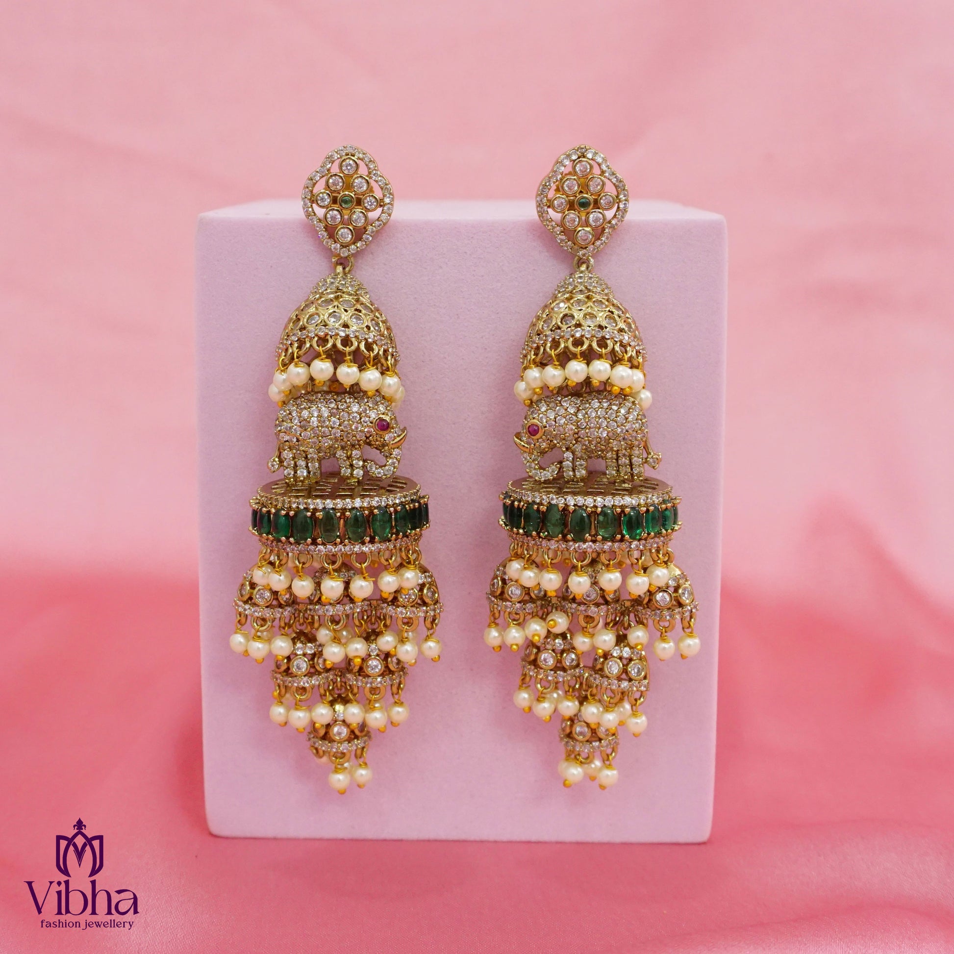 Elephant Designed Heavy Bridal Jhumkas with Step Design and White Pearl Beads