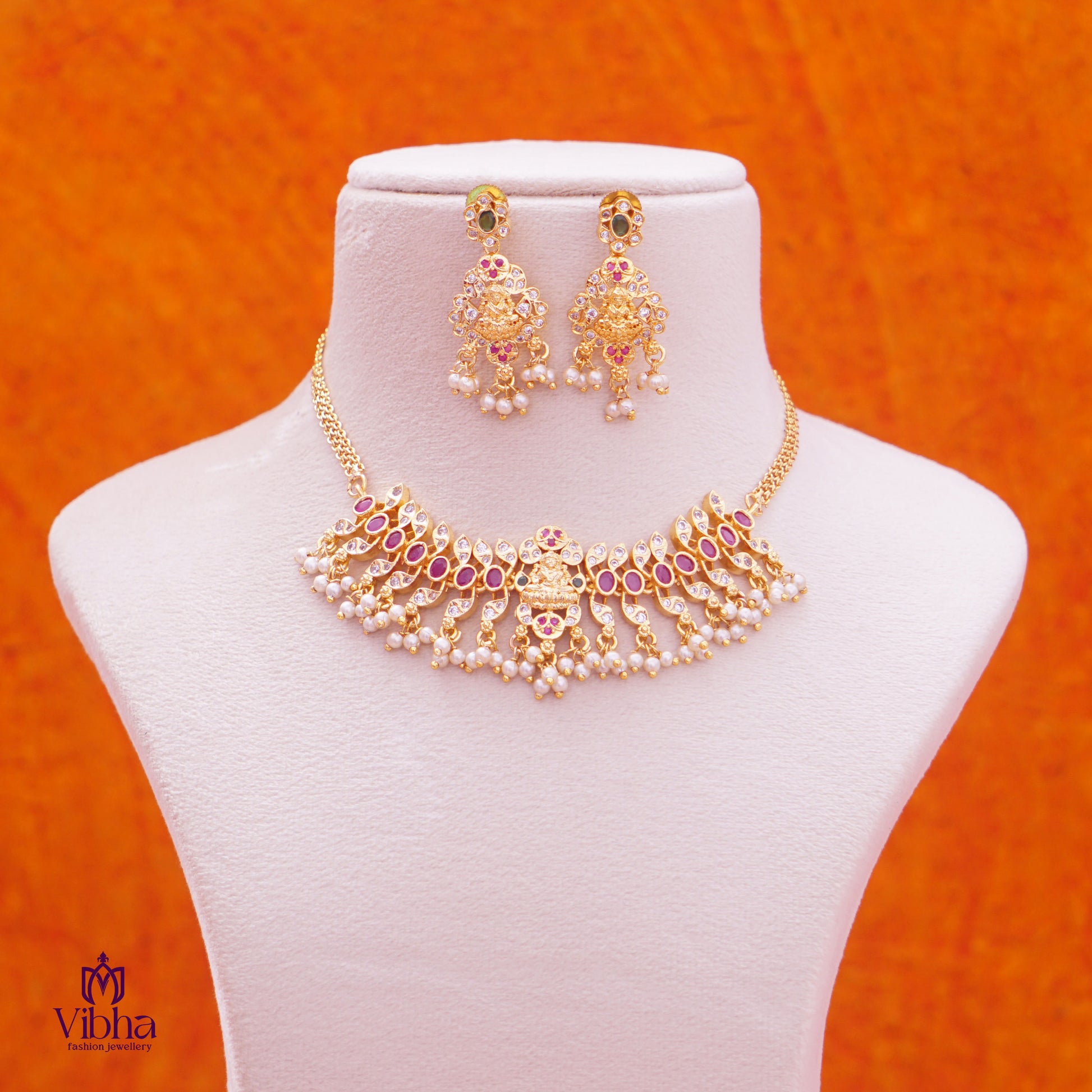 Add this timeless Lakshmi Devi necklace set to your jewelry collection and let its elegance enhance your festive and party attire.