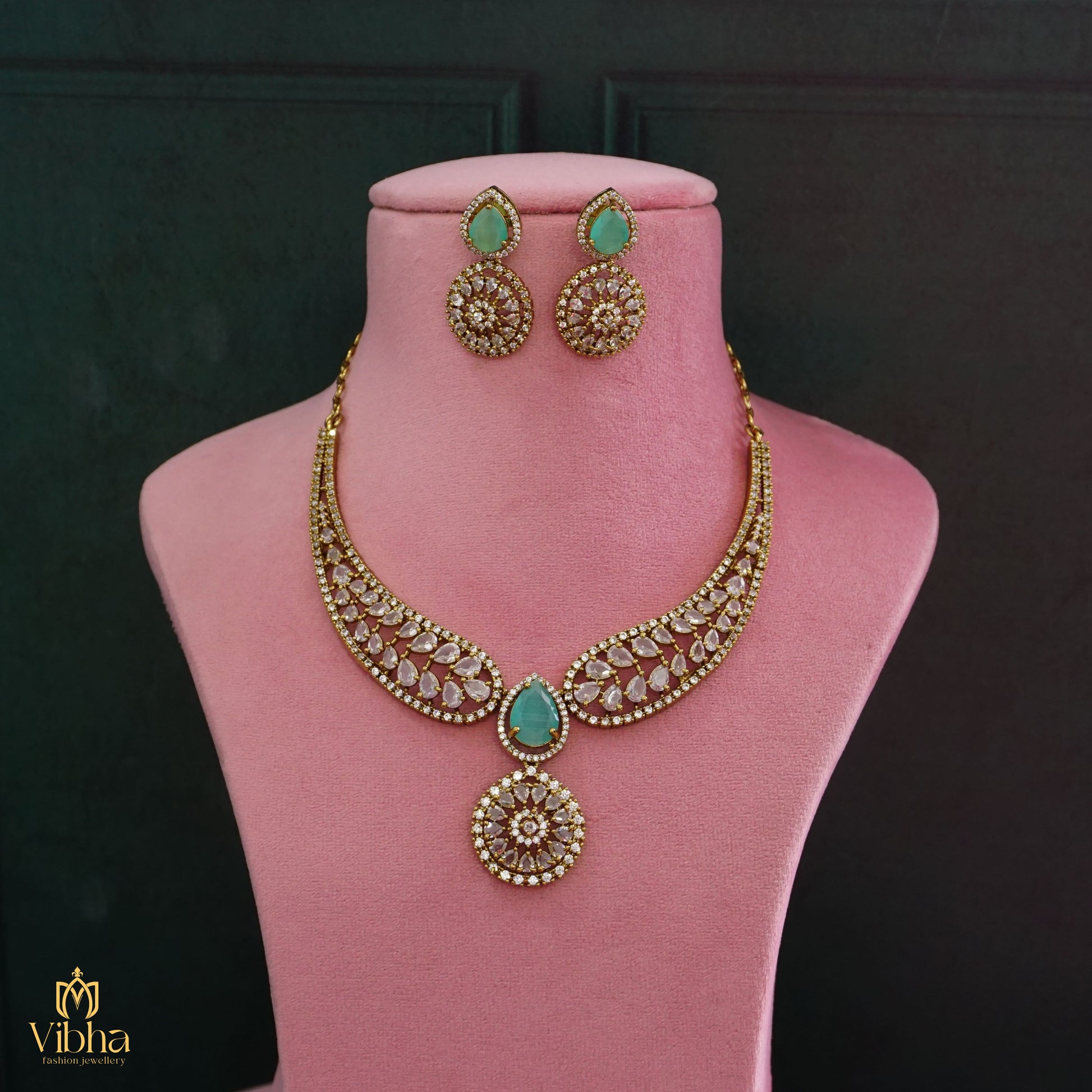 Kante Designed Mehandi Victorian Necklace Set with Zircons & American Diamonds – Available in 4 Variations
