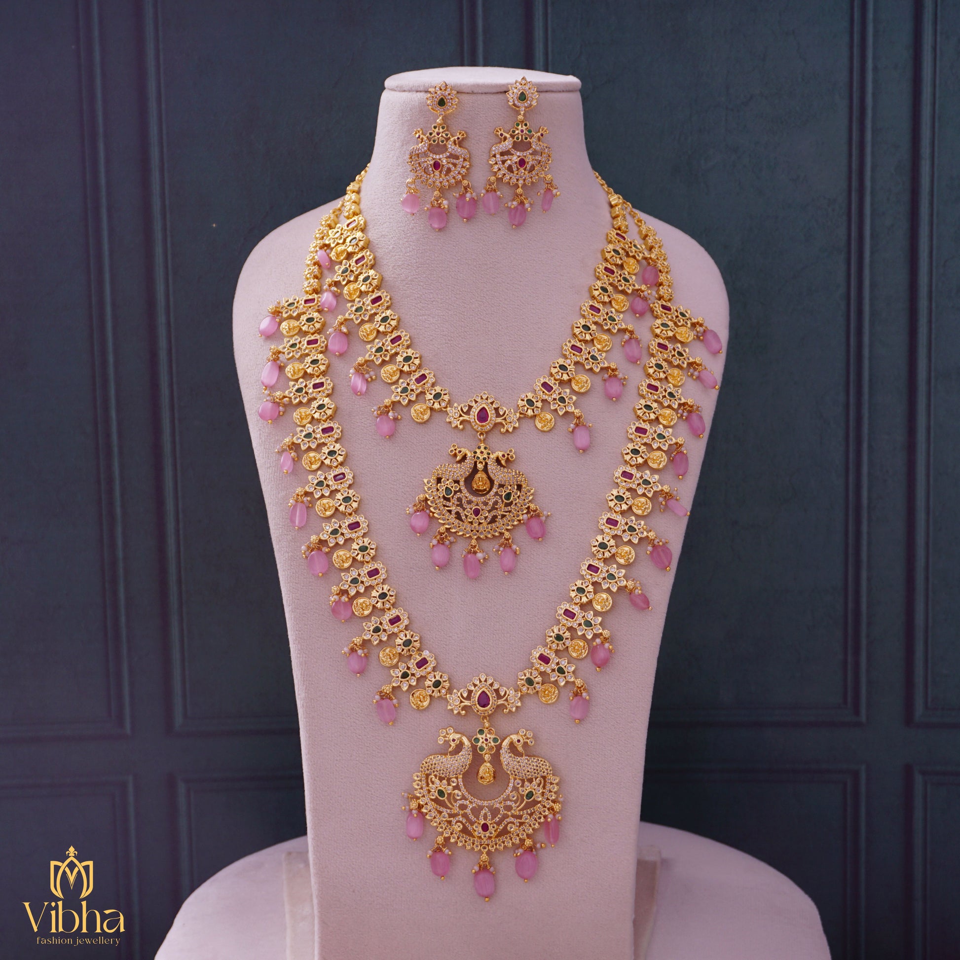 Enhance your traditional look with our exquisite Kasu Designed Lakshmi Devi Combo Set, a timeless piece that beautifully blends heritage and craftsmanship. This stunning set features intricately detailed Lakshmi Devi motifs in a kasu design, adorned with elegant peacock and floral motifs, making it a perfect symbol of traditional elegance. Embedded with zircon, ruby, and emerald stones, and embellished with Monalisa beads and white Gutta Pusalu pearls, this jewelry set exudes richness and sophistication. Expertly crafted from fine-quality copper alloy and plated with premium one-gram gold finish, it is designed to add a touch of opulence to bridal, festive, and party wear. Available in two gorgeous color variations—mint pink and teal—this versatile combo set is a must-have for your jewelry collection.