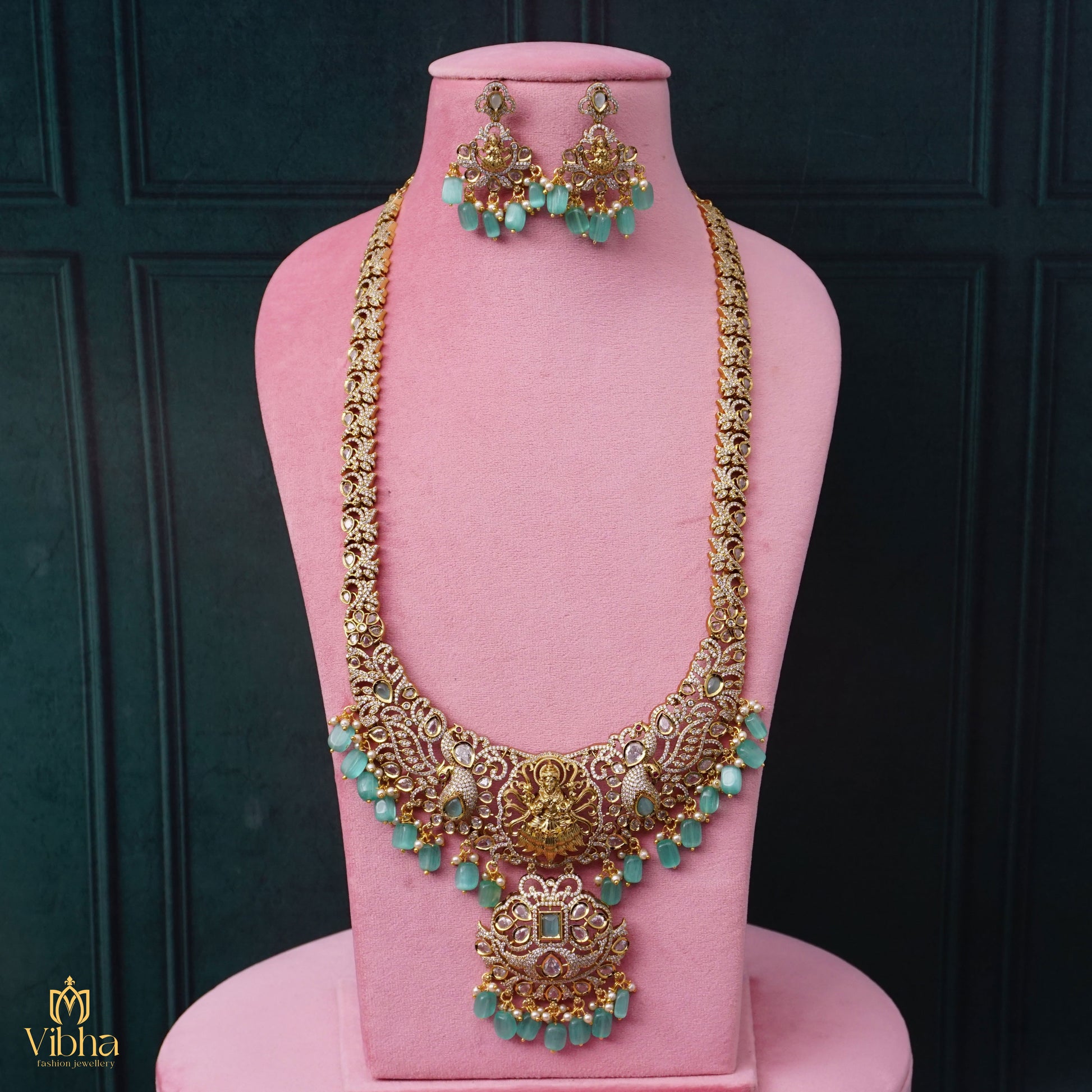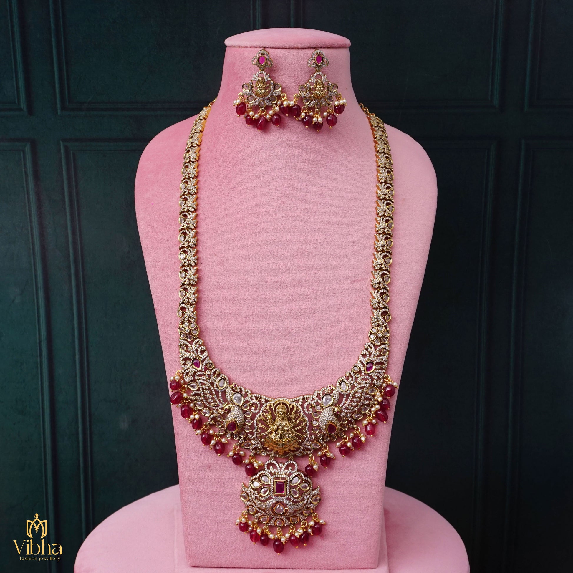 Invoke divine elegance with our opulent Lakshmi Devi Haram Set, intricately designed with symbolic peacock motifs and adorned with a radiant Lakshmi Devi idol at the center. This traditional masterpiece is embellished with sparkling zircons, American diamonds, and zircon stones, offering a dazzling brilliance that elevates your bridal and festive ensemble.