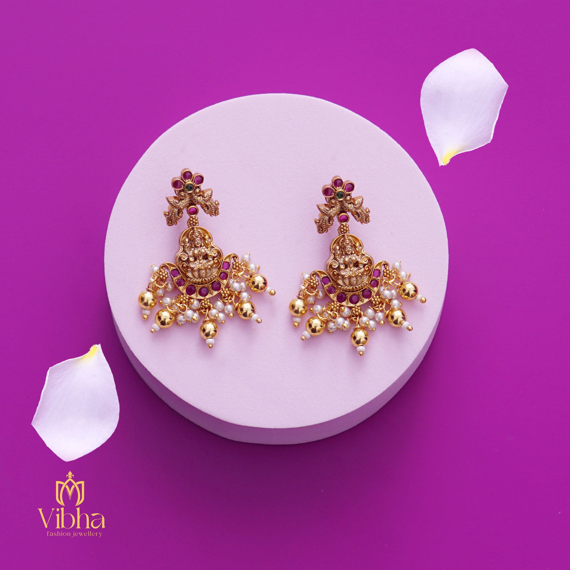 Elevate your attire with our exquisite necklace and earrings set, showcasing a graceful Lakshmi Devi design adorned with intricate floral motifs. This set features embellishments of plain gold balls and delicate white Gutta Pusalu, accented by shimmering ruby and zircon stones. Crafted from fine quality copper alloy and plated with a premium quality antique finish, this ensemble is meticulously designed to enhance your elegance. Ideal for bridal wear outfits, festive occasions, and celebratory gatherings, this set offers timeless sophistication and charm.