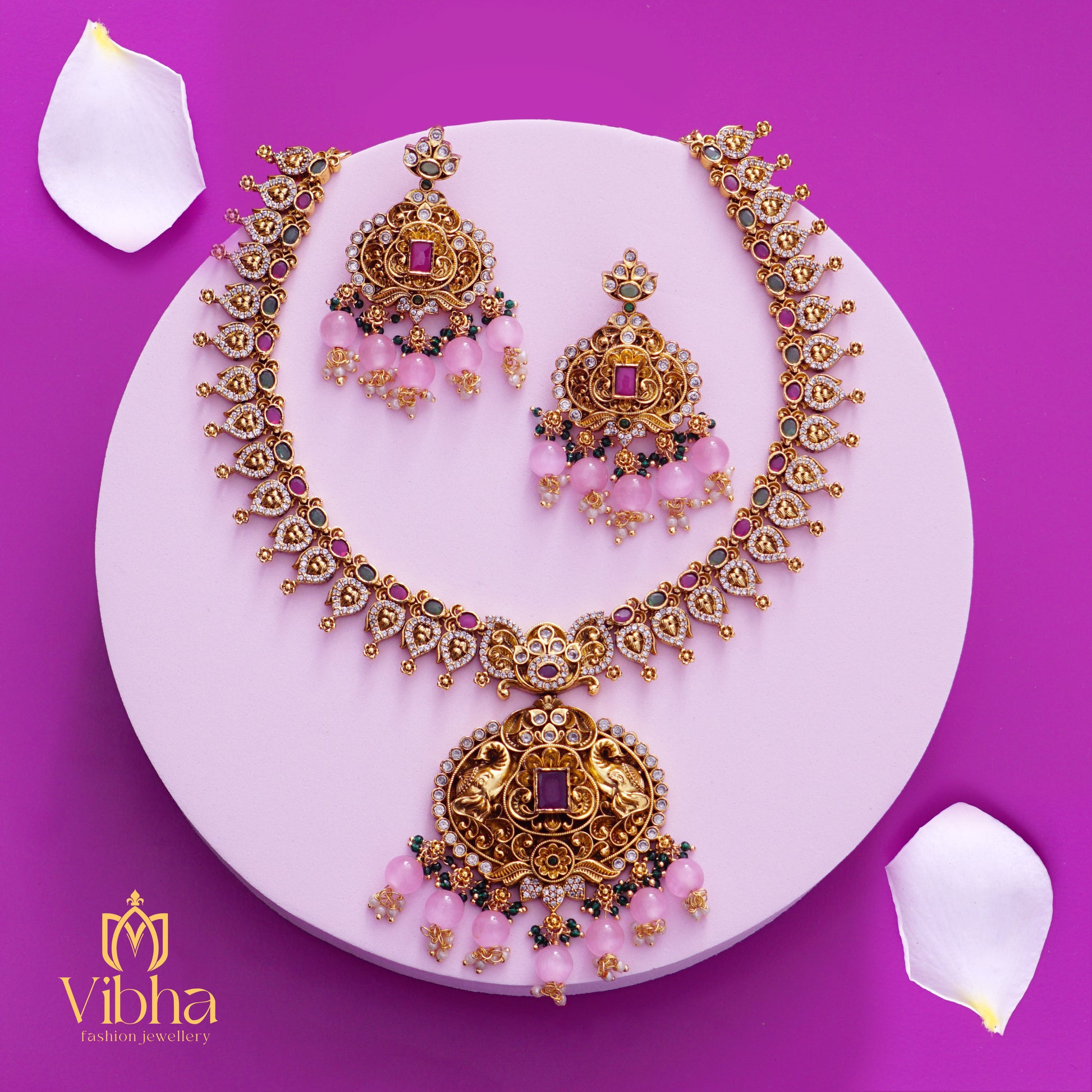 Elevate your jewelry collection with our exquisite necklace and earrings set, featuring a charming drop design adorned with intricate elephant motifs. Embedded with shimmering ruby, emeralds, and zircon stones, this set is meticulously crafted from fine quality copper alloy and plated with premium quality antique finish. It includes round Monalisa beads, white Gutta Pusalu, and spinners Gutta Pusalu, adding a touch of traditional elegance to any ensemble. Perfect for enhancing bridal wear outfits, festive celebrations, and special occasions.