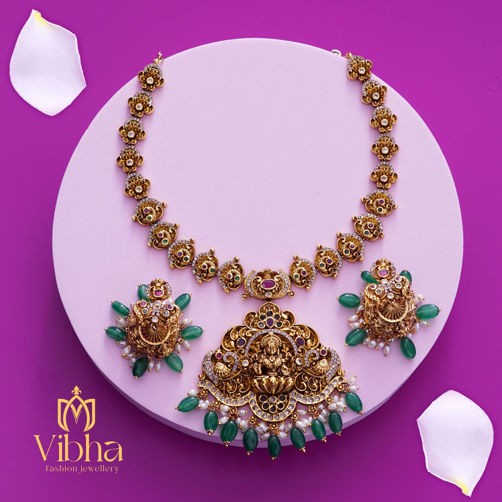 - Exquisite Craftsmanship: Intricate peacock design with Lakshmi Devi and floral motifs, adorned with a combination of ruby, emeralds, American diamonds, and zircon stones for a radiant appeal.