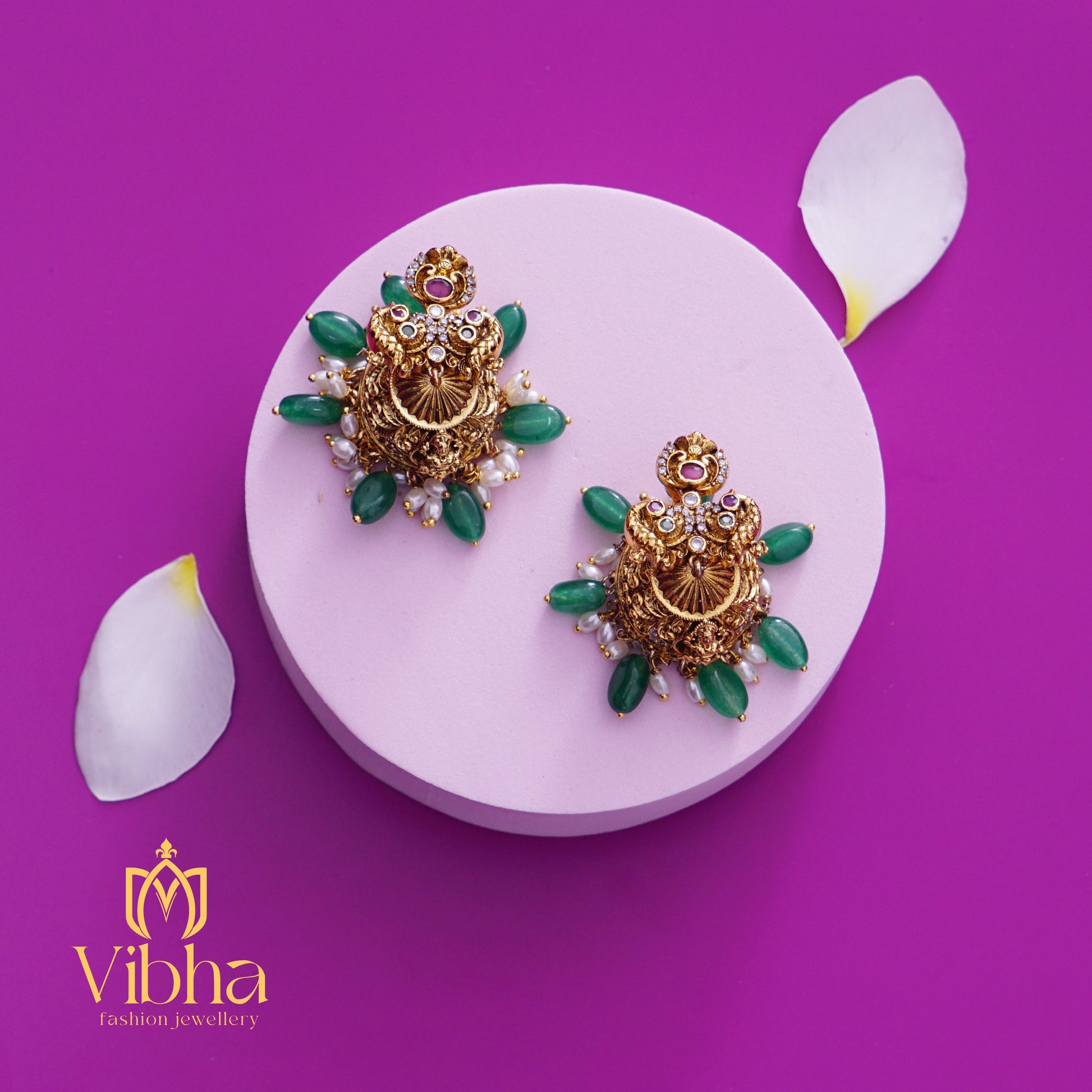 Elevate your jewelry collection with our exquisite necklace and jhumkas set, featuring a stunning peacock design adorned with intricate Lakshmi Devi and floral motifs. This set showcases oval designed Monalisa beads and delicate white Gutta Pusalu, enriched with shimmering ruby, emeralds, American diamonds, and zircon stones. Meticulously crafted from fine quality copper alloy and plated with premium quality antique finish, each piece exudes timeless elegance and charm. Perfect for enhancing bridal wear outfits, festive occasions, and celebratory gatherings, this set offers versatility and sophistication.