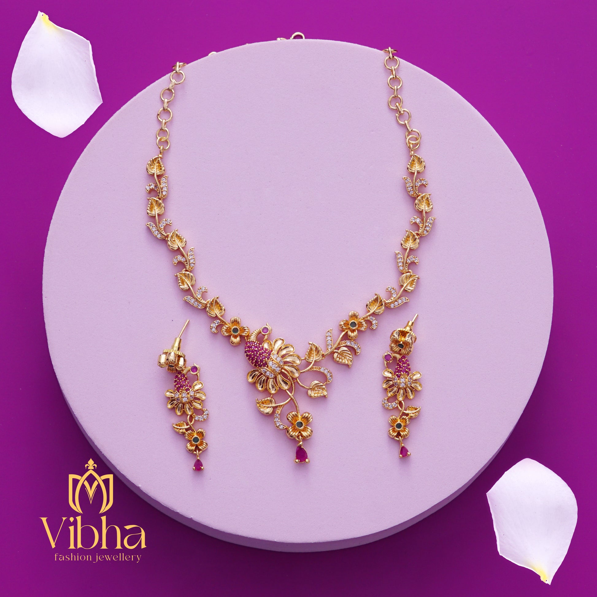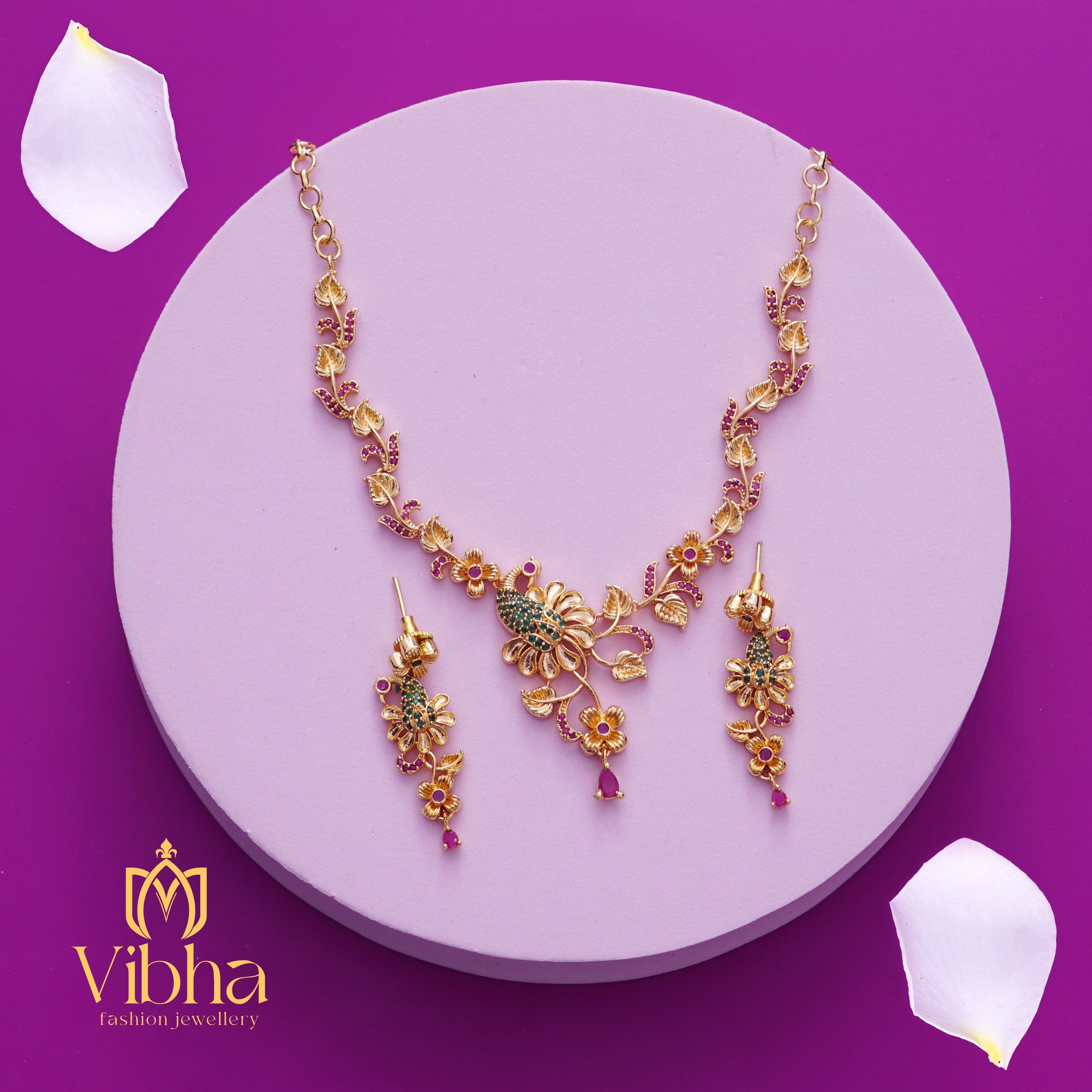 Elevate your jewelry collection with our exquisite necklace and earrings set, featuring a stunning peacock design adorned with intricate leafy motifs. Crafted from fine quality copper alloy and plated with premium quality one gram gold, each piece is embedded with shimmering ruby, emeralds, and zircon stones for a touch of timeless elegance.
