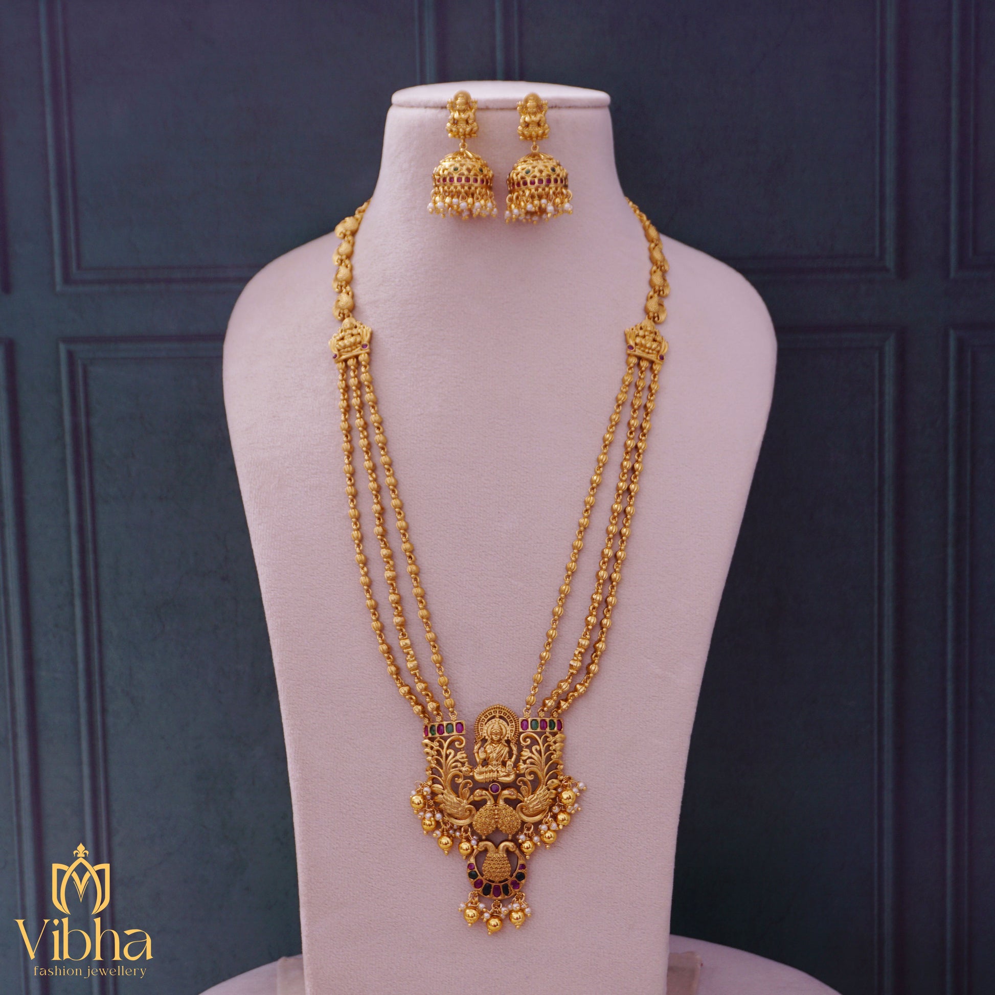 - Design: Three-layered haram with a stunning double peacock and Lakshmi Devi motif
