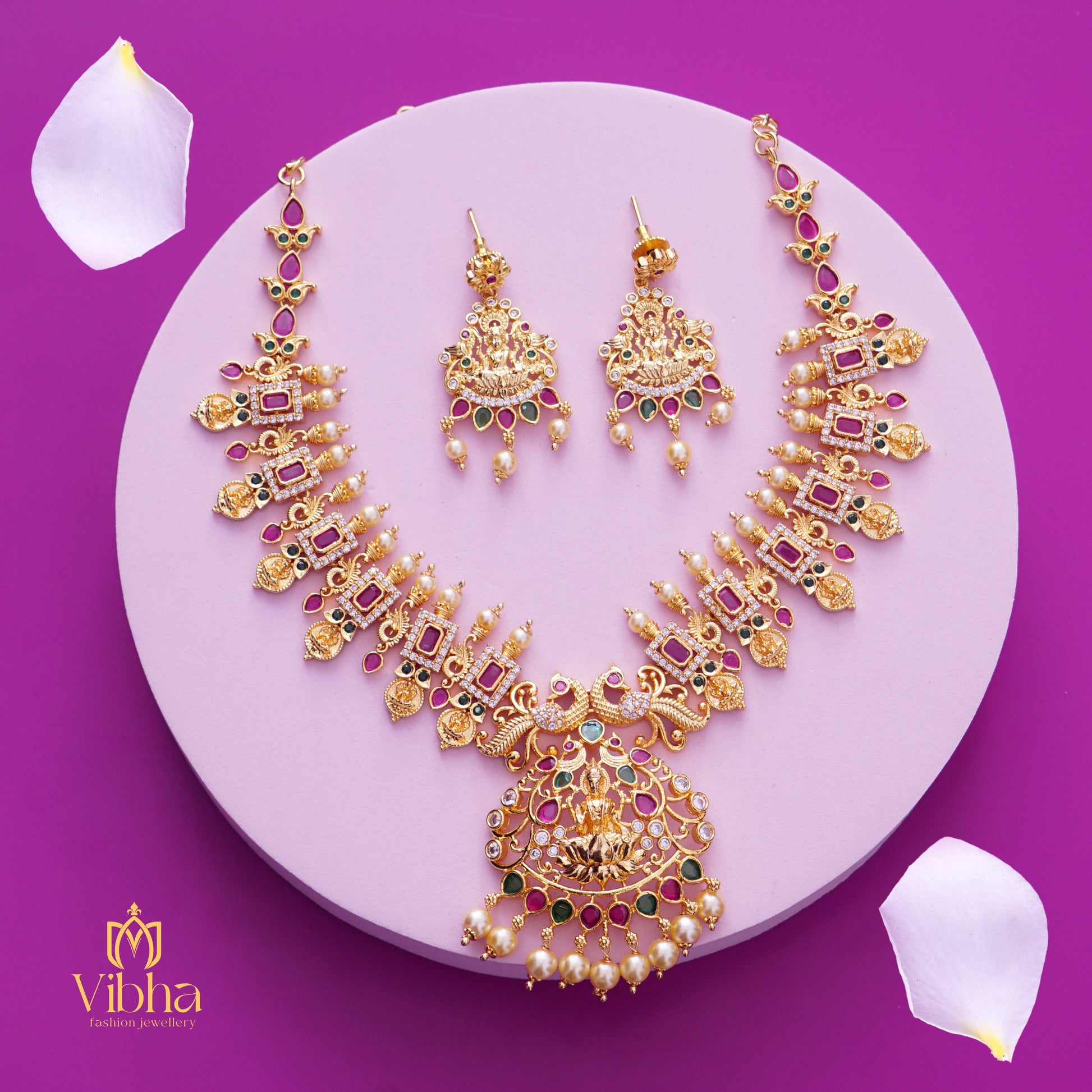 Elevate your elegance with our exquisite double peacock design necklace and earrings set, adorned with intricate Lakshmi Devi kasu motifs. Each piece features artificial pearls and is embedded with radiant ruby, emeralds, American diamonds, and zircon stones, meticulously crafted from fine quality copper alloy and plated with premium quality one gram gold. This set exudes luxury and charm, ideal for enhancing your bridal attire, celebrating festive occasions, and making a statement at parties.