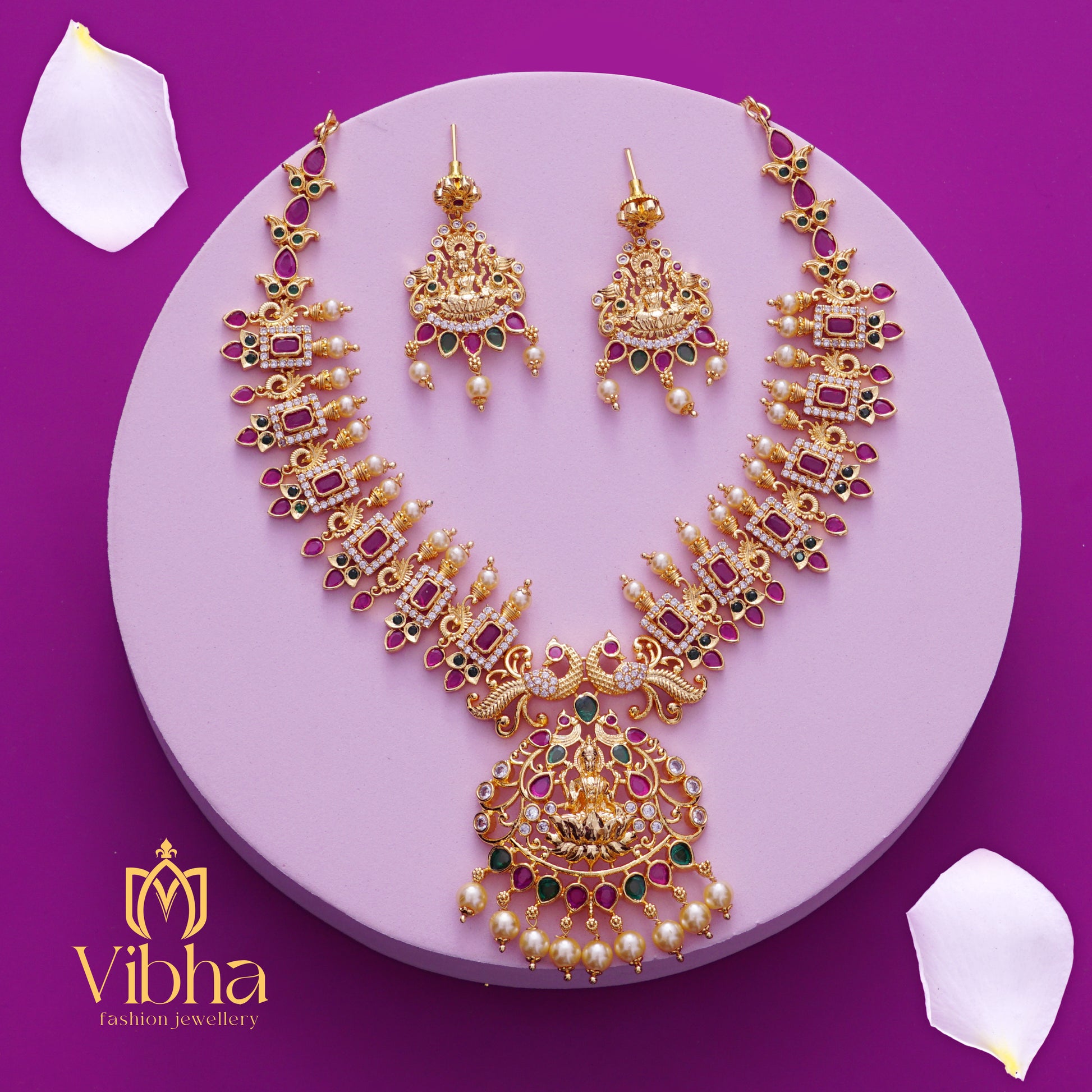 - Exquisite Craftsmanship: Intricate double peacock design featuring a Lakshmi Devi idol, adorned with artificial pearls, rubies, emeralds, American diamonds, and zircon stones.