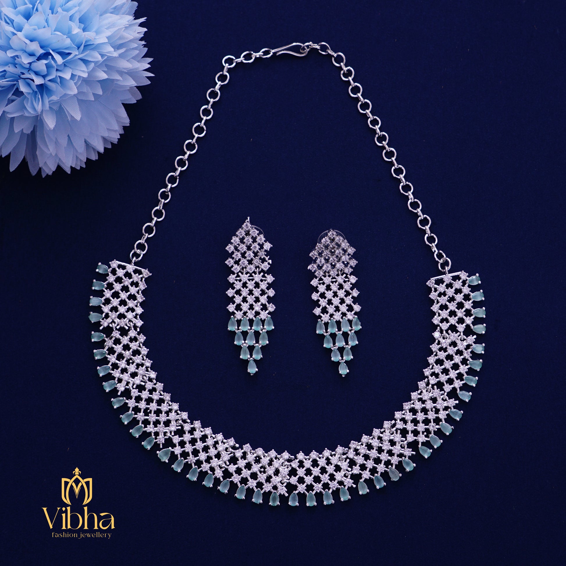 Elevate your style with our exquisite necklace and earrings set, featuring a stunning heavy neck design adorned with shimmering zircon stones. Each piece is meticulously crafted from fine quality copper alloy and plated with premium quality silver finish. Available in two captivating variations—mint pink and mint green—this set is perfect for enhancing your festive wear and party outfits.