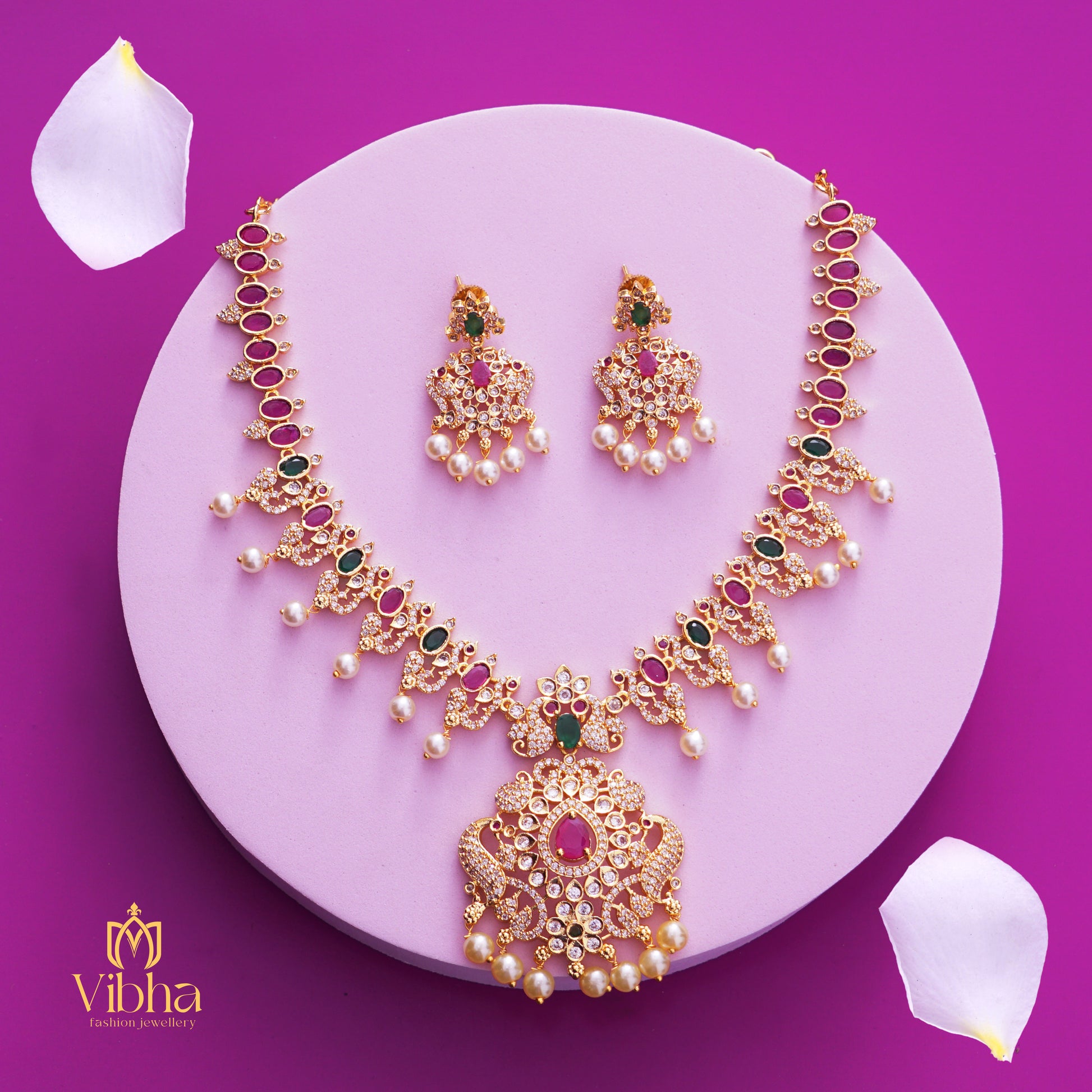 - Exquisite Craftsmanship: Intricately designed peacock motif adorned with artificial pearls and embellished with radiant ruby, emeralds, American diamonds, and zircon stones.